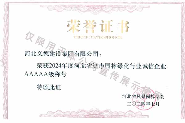 近年來(lái),我公司始終秉持穩(wěn)健經(jīng)營(yíng)、精益求精的發(fā)展理念,憑借扎實(shí)的綜合實(shí)力與良好的行業(yè)口碑屢獲認(rèn)可,先后被授予河北省扶貧龍頭企業(yè)、國(guó)家林業(yè)標(biāo)準(zhǔn)化示范企業(yè)、2019年度全國(guó)苗圃50強(qiáng)、2018-2019年度河北省林業(yè)重點(diǎn)龍頭企業(yè)、保定市精品特色現(xiàn)代農(nóng)業(yè)園區(qū)等稱(chēng)號(hào);在誠(chéng)信經(jīng)營(yíng)與行業(yè)建設(shè)領(lǐng)域,更是接連獲得2019-2023年河北省建設(shè)工程招標(biāo)投標(biāo)誠(chéng)實(shí)守信5A級(jí)施工企業(yè)、2019-2024年河北省城市園林綠化行業(yè)誠(chéng)信5A級(jí)企業(yè)、2021-2023年河北省誠(chéng)信企業(yè)、2021-2024年度河北省園林優(yōu)秀企業(yè)、2023-2024年河北省風(fēng)景園林學(xué)會(huì)先進(jìn)集體及2025年度安國(guó)市“誠(chéng)信企業(yè)”等多項(xiàng)榮譽(yù),凸顯了公司在扶貧攻堅(jiān)、林業(yè)標(biāo)準(zhǔn)化發(fā)展、工程施工及誠(chéng)信經(jīng)營(yíng)等多方面的扎實(shí)基礎(chǔ)與優(yōu)勢(shì)。